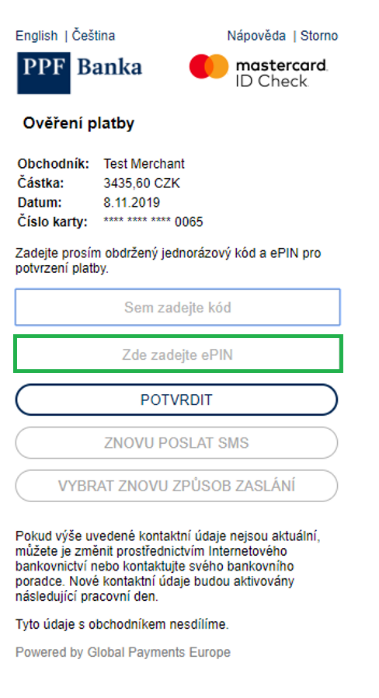 Dne 4. 1. 2021 obdrží naši klienti na e-mail (případně SMS zprávou) e-PIN k Debetní kartě, který budou zadávat spolu s jednorázovým autorizačním kódem z SMS při každé internetové platbě (E-commerce transakce). Nebudou-li na Debetní kartě k 4. 1. 2021 povolené internetové platby, e-PIN jim bude zaslán až v momentě, kdy k tomuto povolení dojde. Pokud jsou naši klienti Držitelem více Debetních karet vydaných PPF bankou, obdrží samostatný e-PIN pro každou z těchto Debetních karet zvlášť. Všechny obdržené e-PINy je třeba pečlivě uschovat a informovat všechny ostatní Držitele karet.