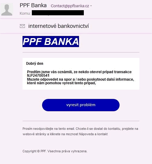 We draw your attention to fraudulent emails distributed on behalf of PPF banka a.s. from Contact@ppfbanka.cz or customer.service@ppfbanka.cz. Emails are called "internetové bankovnictví" or „PRIHLÁSENÍ DO INTERNETBANKINGU“ and are related to transaction verification N.P24700541 or blocking of internet banking.