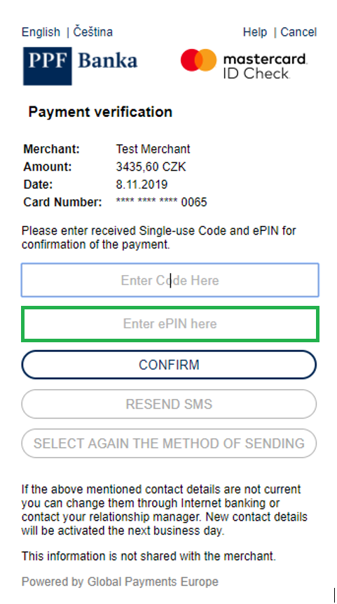 Our clients will receive the Debit Card e-PIN to the email (or in an SMS message), on 4 January 2021. This number, together with a single-use code received via text message, is to be entered whenever our clients make a payment online (E-commerce transaction). If our clients do not have online payments enabled for the Debit Card on 4 January 2021, an e-PIN will not be sent to our clients until they are enabled. If they hold multiple Debit Cards issued by PPF banka, an e-PIN will be sent to our clients separately for each of these Debit Cards. Please keep all the e-PINs received safe and inform all other Cardholders.